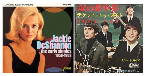 ■ジャッキー・デシャノンとビートルズ ジャッキー・デシャノンはアメリカの女性シンガー・ソングライター。1960年代のロック時代に登場した最も初期の女性シンガー・ソングライターと言われることもあります。 1980年代にヒットしたキム・カーンズの「Betty Daves Eyes」はデシャノンの作ですが、1960年代半ばにサーチャーズのヴァージョンでヒットし、フォーク・ロックの原型といわれる「Needle And Pins」(1963年 全英1位 全米13位)も元々はデシャノンのレパートリーで、さらに「When You Walk in the Room」はデシャノンの作です。このサーチャーズの「When You Walk in the Room」(1964年 全英3位 全米35位)の12弦ギターのイントロのリフはデシャノンのオリジナル・ヴァージョンをそのまま引用したものです。 デシャノンは1964年夏のビートルズ全米ツアーのオープナーとして起用されますが、その際にジョージ・ハリスンがデシャノンに「When You Walk in the Room」のリフを弾いて聴かせてほしいと言ったそうです。それがビートルズの「Ticket To Ride」のリフに繋がったという説があり、確かに12弦ギターのこのリフはよく似ています。 ジャッキー・デシャノン「When You Walk in the Room」のイントロ・リフ(音が出ます) ビートルズ「Ticket To Ride」のイントロ・リフ(音が出ます)