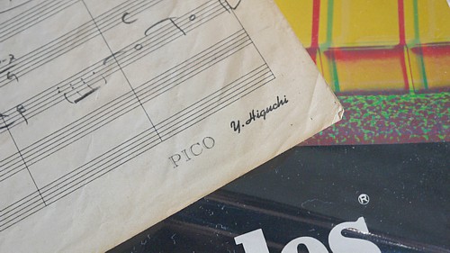 ■樋口康雄さんの譜面 ファイルの整理をしていたら、ずっと行方不明だった樋口康雄さんの書いた譜面が出てきました。思えば、これが私の音楽的キャリアの起点だったんだなぁと。 そういえば、昔はこんなオリジナルの五線紙を使う方もいて、井上鑑さんもオリジナルのイラストが余白に入っている五線紙をお使いになっていた記憶。加えて、昔は大きなスタジオのロビーには必ず写譜屋さんがいて、編曲家さんの書いた細密画のようなスコアから印刷したみたいにきれいなパート譜を書き起こし、ミュージシャンそれぞれに渡すのでした。